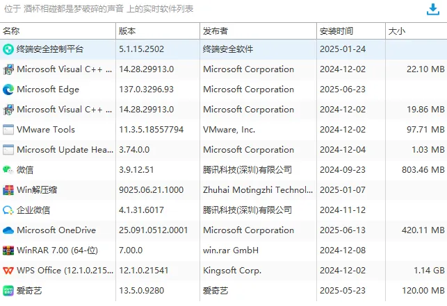 它自动扫描企业所有办公终端上的版本、发布者、安装时间和大小等所有软件的信息,并用清晰的表格列出来。