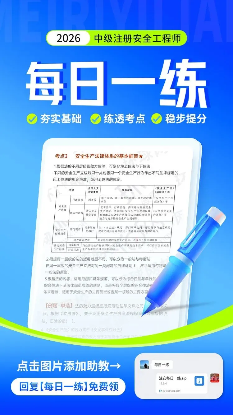 其实想要避开这个坑,不用逼自己每天花几个小时死磕,咱们用“碎片化备考”就能轻松突围——毕竟通关的考生,大多都是靠每天一点点的积累,而这份《注安每日一练》,就是帮大家轻松积累、稳步上岸的好帮手。