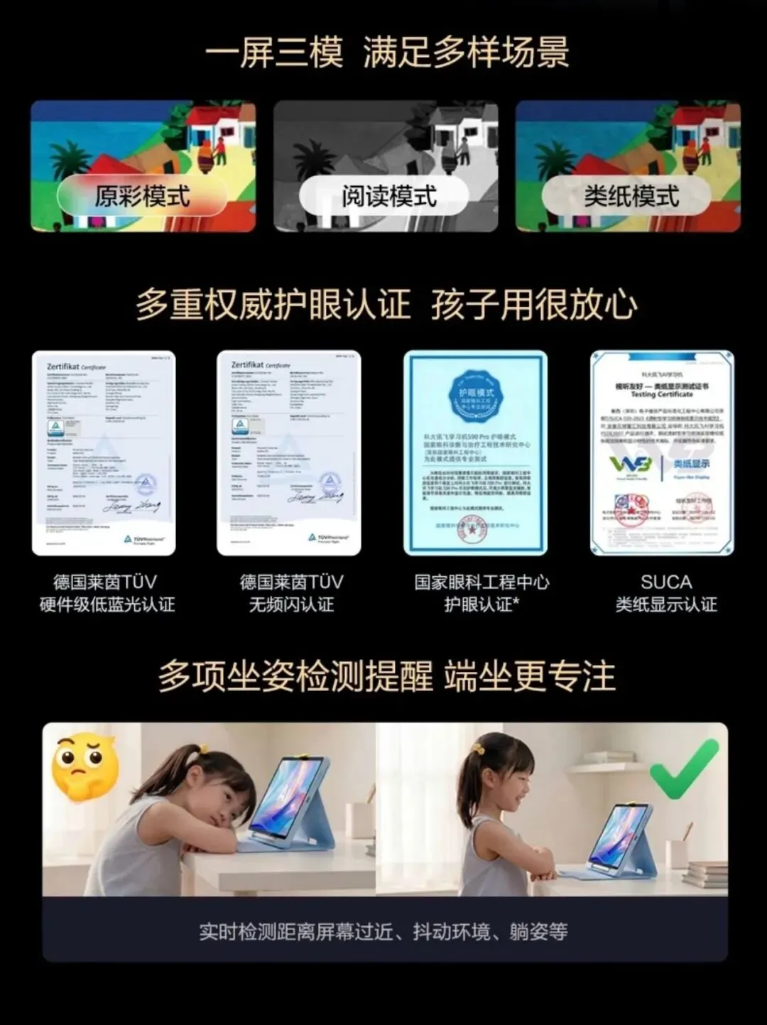 德国莱茵TÜV硬件级低蓝光认证、德国莱茵TÜV无频闪认证、国家眼科工程中心护眼认证、SUCA类纸显示认证