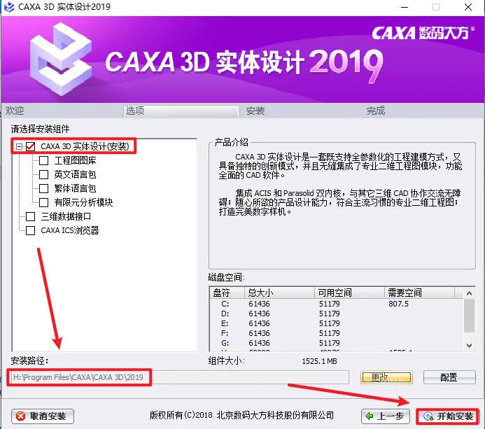5.选择勾选“需要安装的组件”,选择软件的安装路基,安装路径不要出现中文,点击“开始安装”