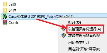 10.找到并选中"Caxa实体设计2019SP0_Patch(X86+X64)",右键选择"以管理员身份运行"