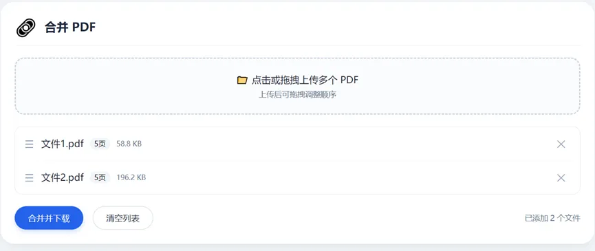 直接拖拽多个PDF进来,按住文件前的“☰”图标上下拖动就能调整顺序。