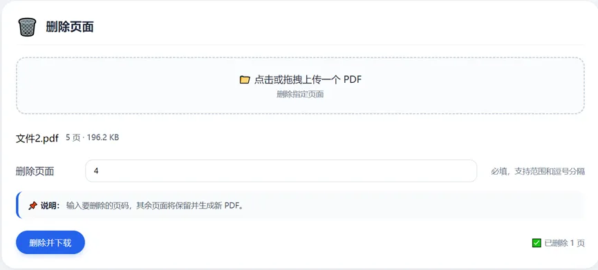 直接输入页码,比如“2,4,6-8”,这些页面就会被彻底移除,生成一个干干净净的新文件。再也不用手动删完另存了。