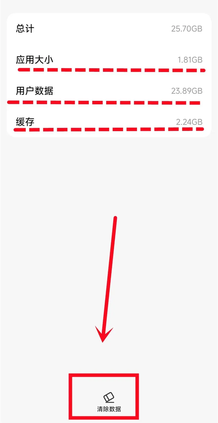 看到没有,在这里就可以看到软件的缓存数据和用户数据了对吧,这个用户数据啊,就是我们在使用时产生的数据了,比如说像一些图片啊,视频啊之类的,而缓存就是一些没用的文件了,这些如果不删除的话,是不是就会一直藏在手机里面,占用咱们的手机空间了!