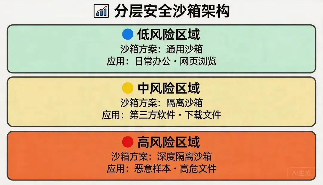 分级的好处是速度快、安全、成本低。不用所有操作都开 Docker,省资源;高风险操作用强隔离,出问题也不怕。