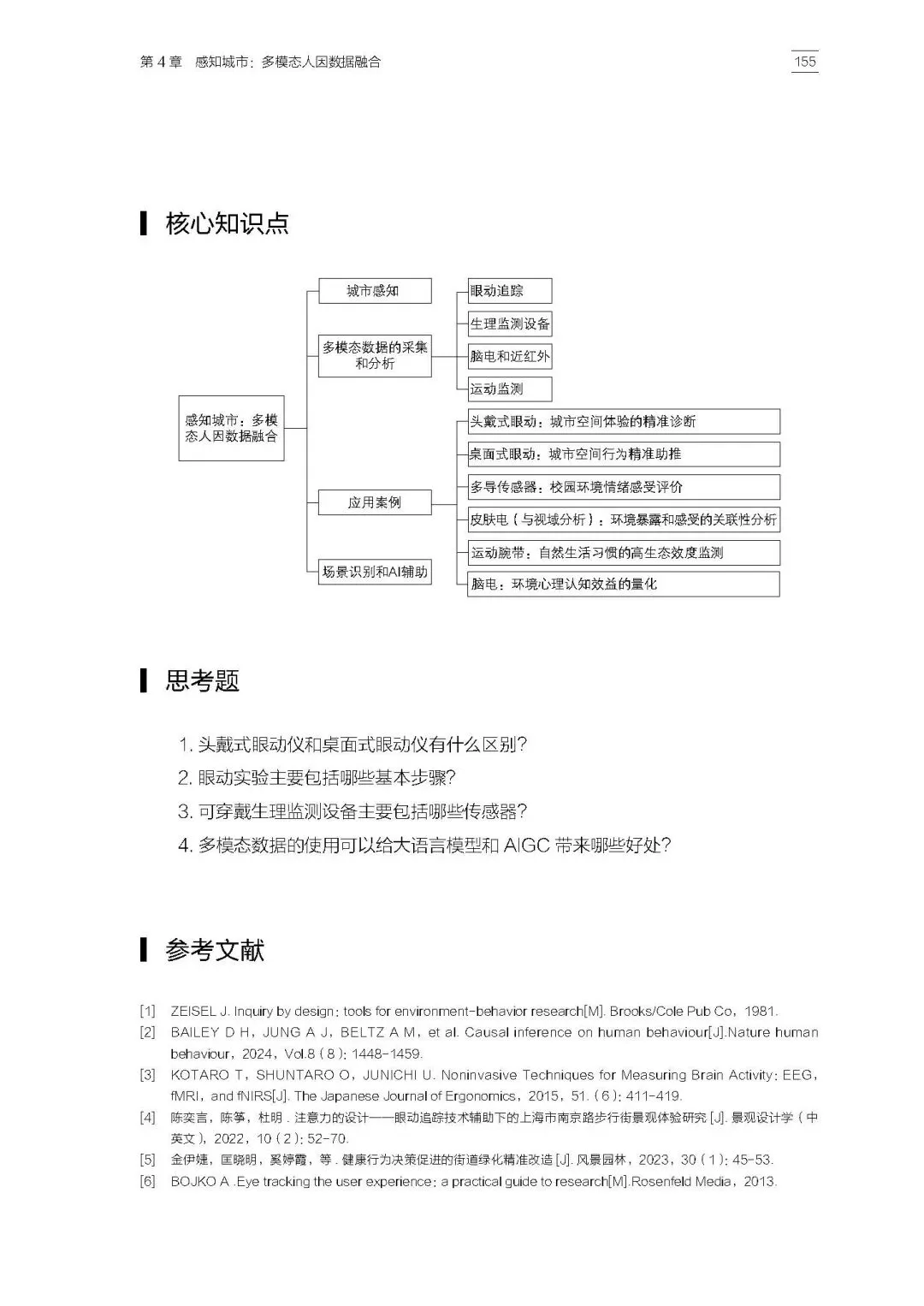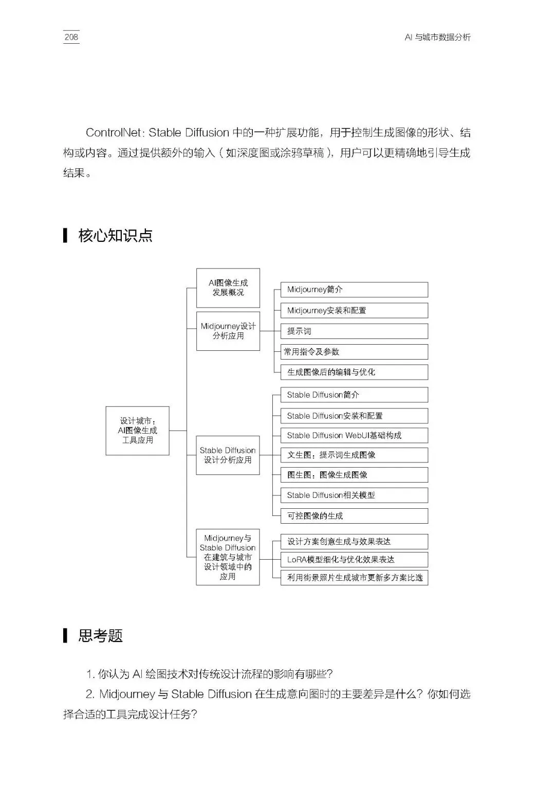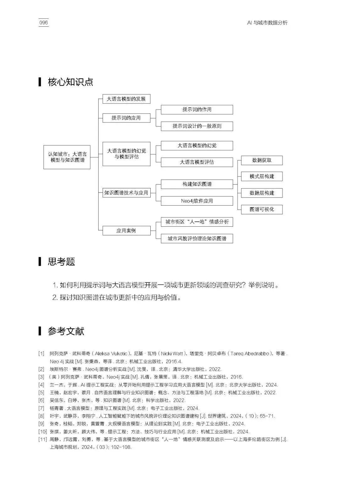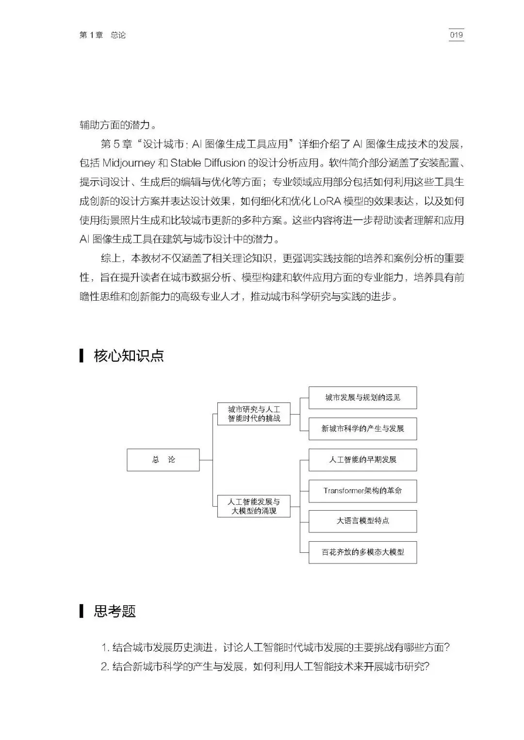 全书章节内容丰富、逻辑清晰,第1章和第2章帮助学生建立人工智能时代的知识背景与城市数据思维,第3章至第5章则分别从大语言模型与知识图谱、多模态人因数据融合、AI图像生成工具应用等方向展开,既体现了学术前沿,也兼顾了教学可操作性。