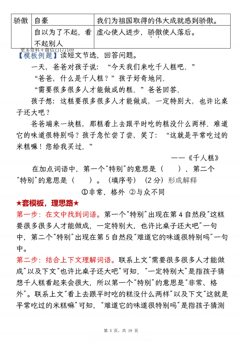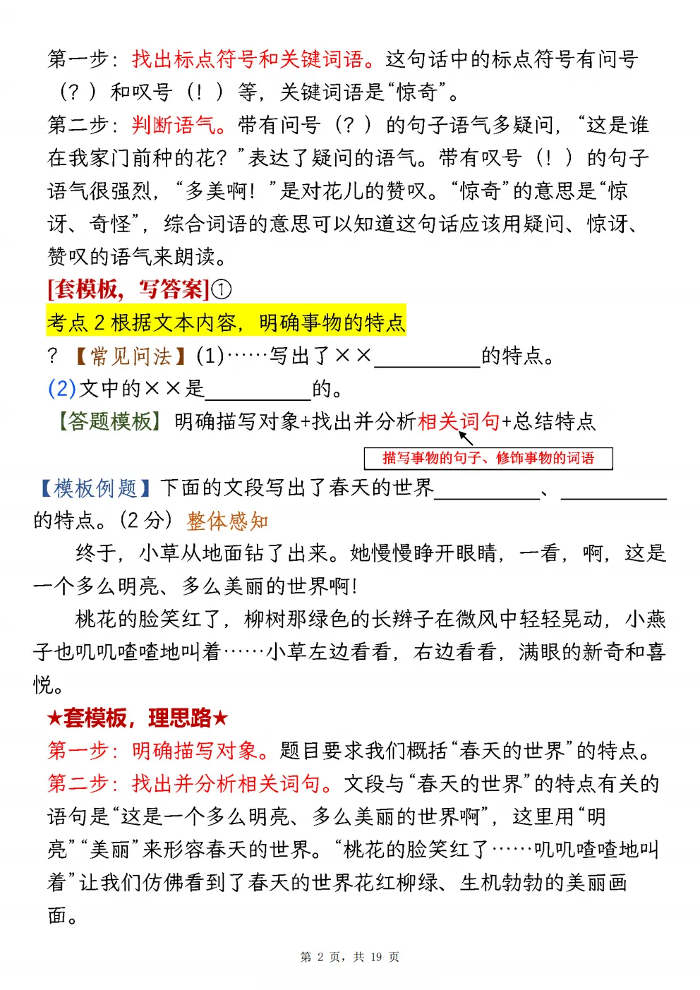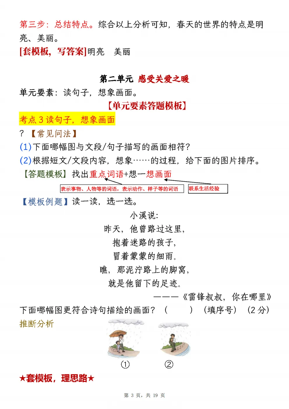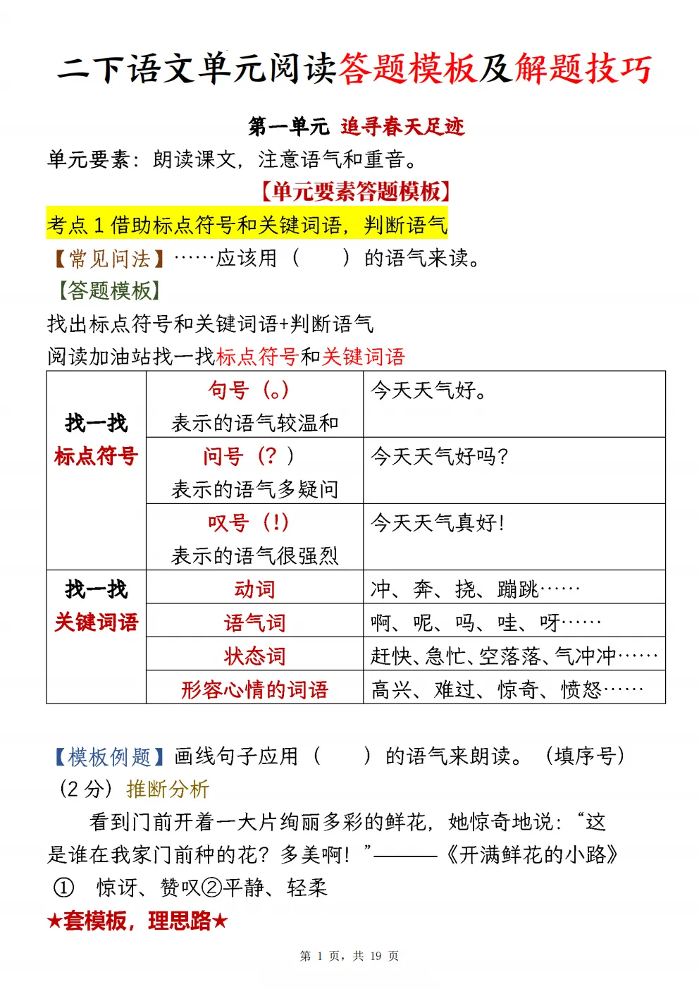 26年新二年级下册语文《单元阅读答题模板及解题技巧》共19页,电子版可打印,阅读理解是期中期末必考难点,这份资料总结常见题型与规范答题思路,孩子易懂易记,能快速掌握找中心、抓关键词、按点答题等方法。用课文将阅读理解中常见的题型,语气判断、特点概括、画面想象、词语理解等都总结到练习范围,覆盖面广,遵循“常见问法 → 答题模板 → 模板例题 → 解题思路”,让孩子在练习中熟悉掌握答题技巧,有需要的家长可以打印出来,让孩子练一练哦。