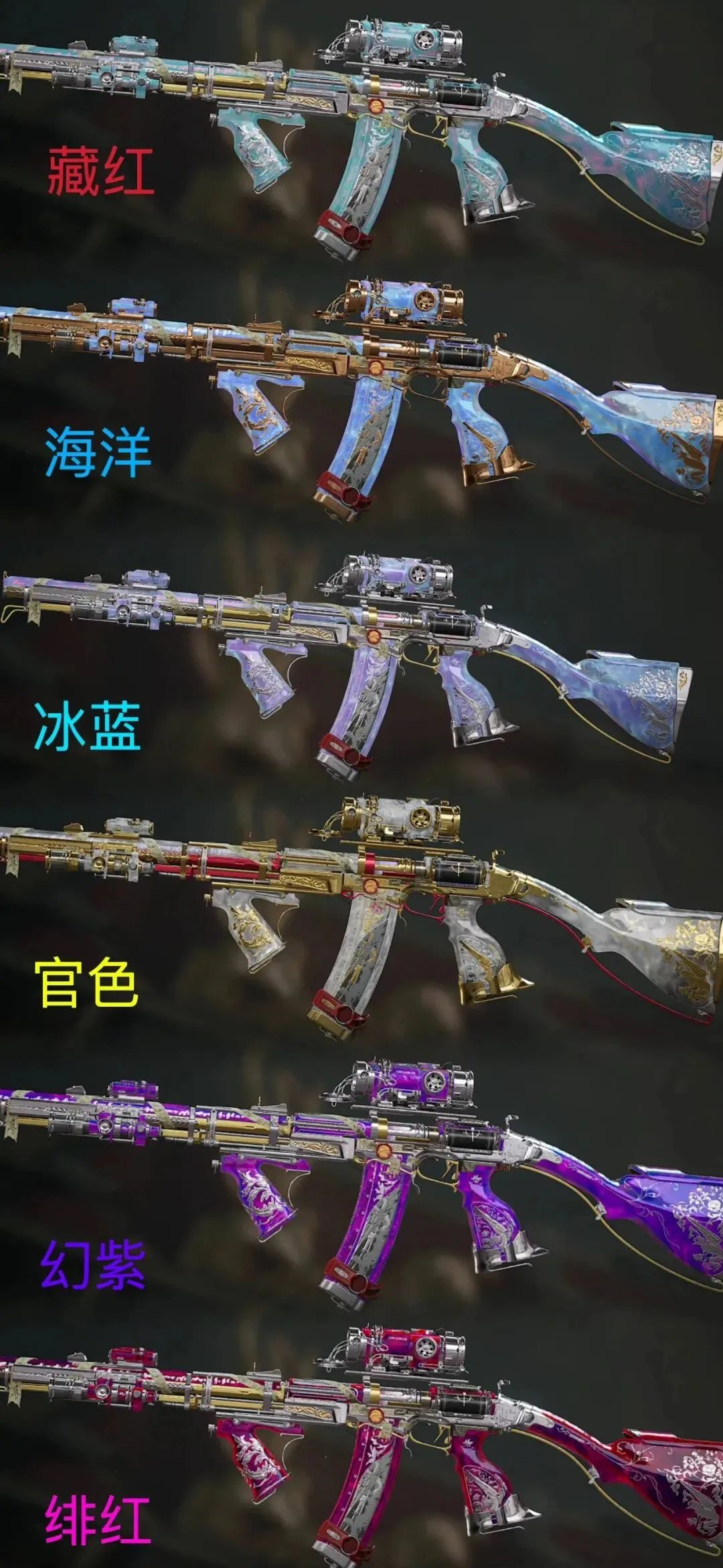 后来我又试过几种颜色,感觉就更明显。像官色这种,金白底加一点红,整体层次清楚,花纹有,但不乱,我拉近点位的时候不容易被枪身本身抢注意力。海洋也顺,蓝和金的过渡比较稳,镜上那块不炸。冰蓝属于耐看型,长时间打不累。反过来,幻紫和绯红不是不好看,单看很抓眼,可一旦进暗一点的室内,或者我连续转两次角,余光真的容易被颜色拖一下。那一下很轻,可搜打撤里,轻一下也够烦。