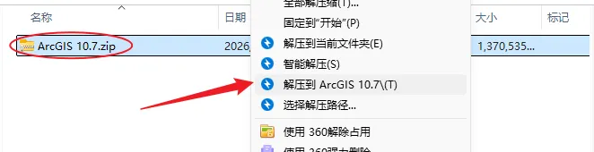 1.鼠标右击下载的【ArcGIS 10.7】压缩包,选择解压到【ArcGIS 10.7】。