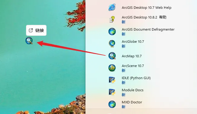 14.在桌面左下角的开始菜单中找到【ArcMap】软件,鼠标左键拖拽到桌面上即可创建桌面快捷方式。