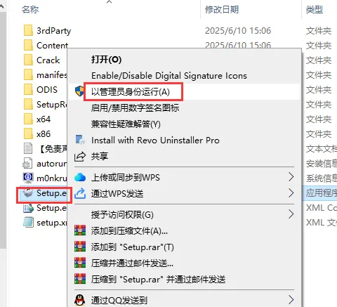 进入解压后的 Setup 文件夹,右键点击 Setup.exe 选择"以管理员身份运行"。