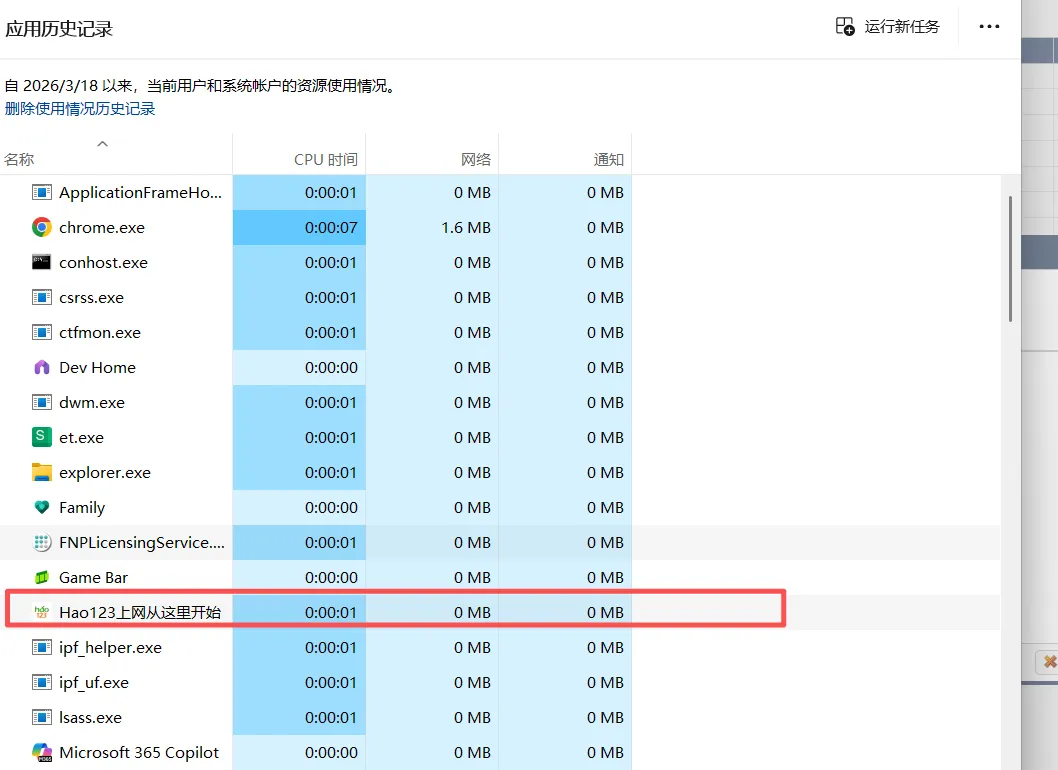 回到你截图的「应用历史记录」页面,右键 Hao123上网从这里开始→ 选择「结束任务」再去刚才找到的文件所在位置,直接删除整个 hao123文件夹清空回收站