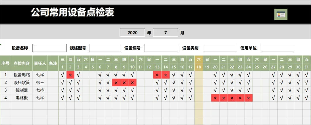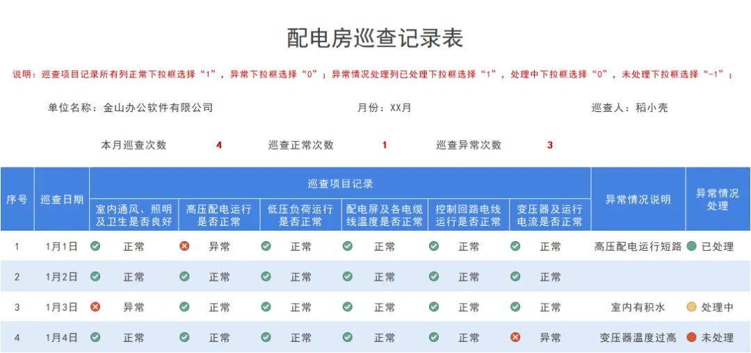 填完之后想知道哪个设备出问题多?模板里预留了统计区,照着填完数据,异常频次一目了然,不用自己写公式;拿着套用就行!