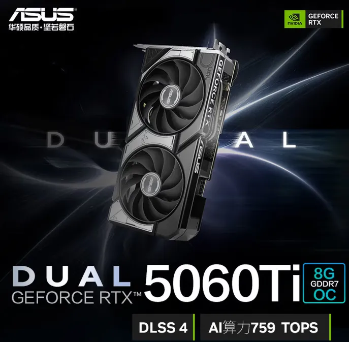 华硕RTX5060Ti显卡采用8GB的GDDR7大容量显存,128bit显存位宽,显存带宽28Gbps,核心频率2602~2632MHz,4608个CUDA核心,4nm制作工艺,5+2相供电,TDP功耗180W,需要8pin外接供电,电源要求额定550W及以上,3×DP2.1b+1×HDMI 2.1b输出接口,支持DLSS 4.5技术和光线追踪,支持智能启停的双风扇,尺寸229×120×50mm,3年质保。