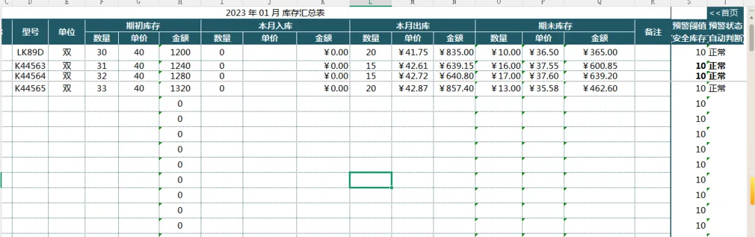 ◦当期末库存<预警阈值时,显示「库存不足」并自动红底高亮提示