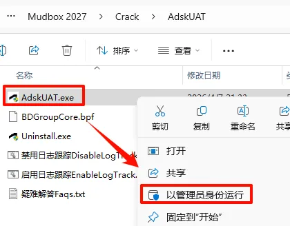 7.返回之前解压的“Mudbox 2027”文件夹,依次打开“Crack——AdskUAT”文件夹,选中“AdskUAT.exe”文件,鼠标右键选择“以管理员身份运行”