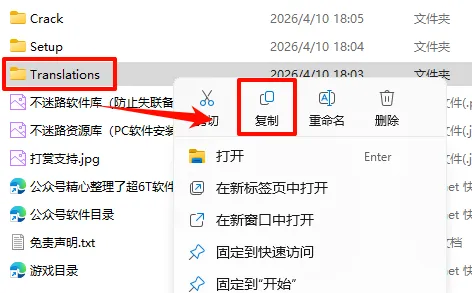 10.返回之前解压的“Mudbox 2027”文件夹,选中“Translations”文件夹,鼠标右键选择“复制”