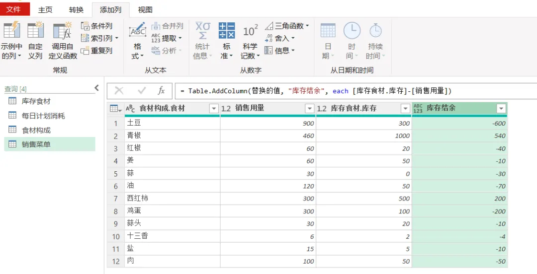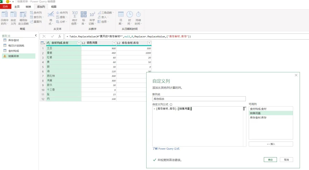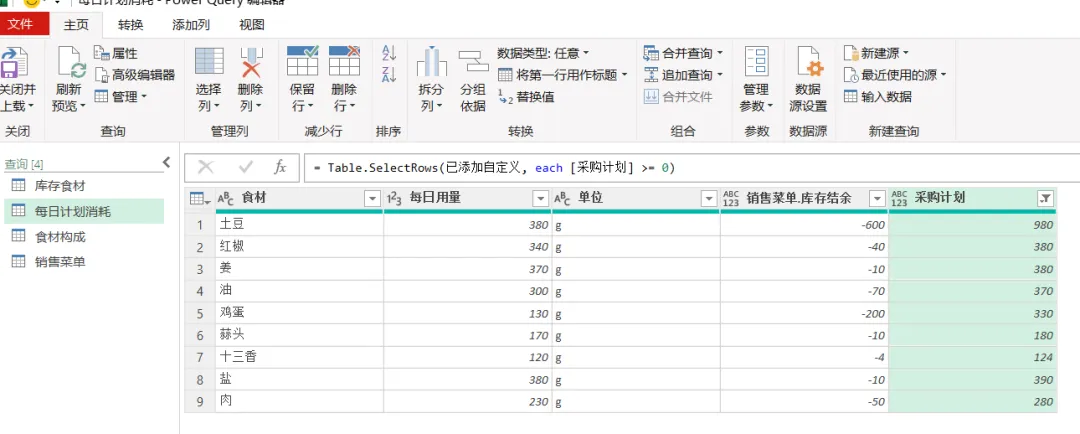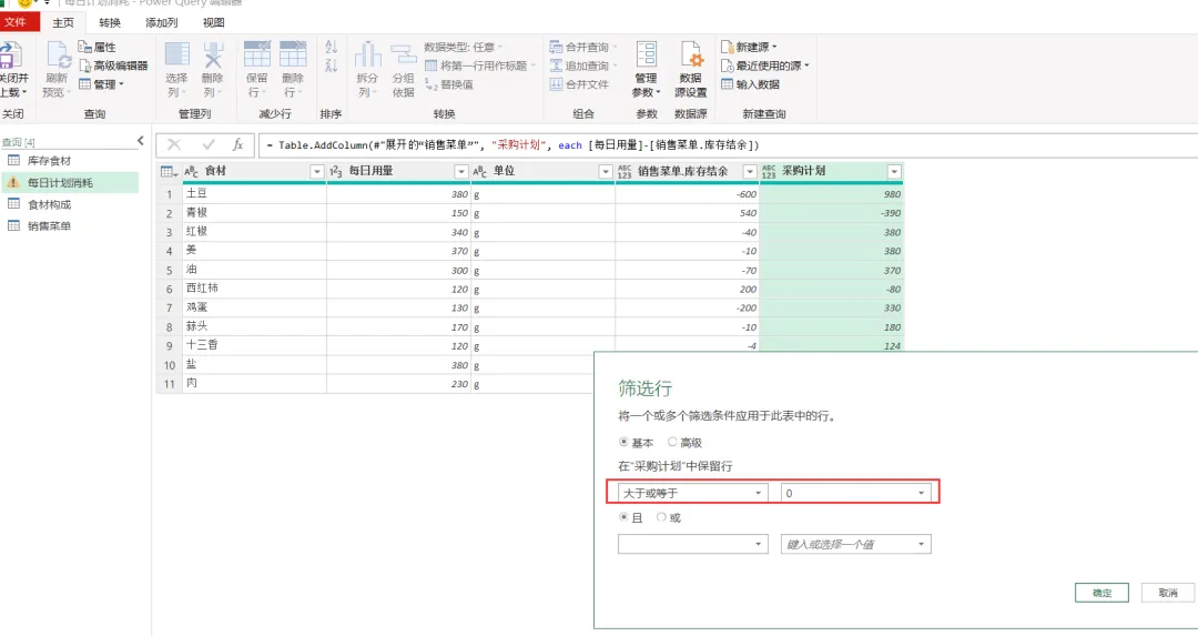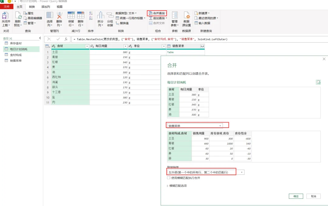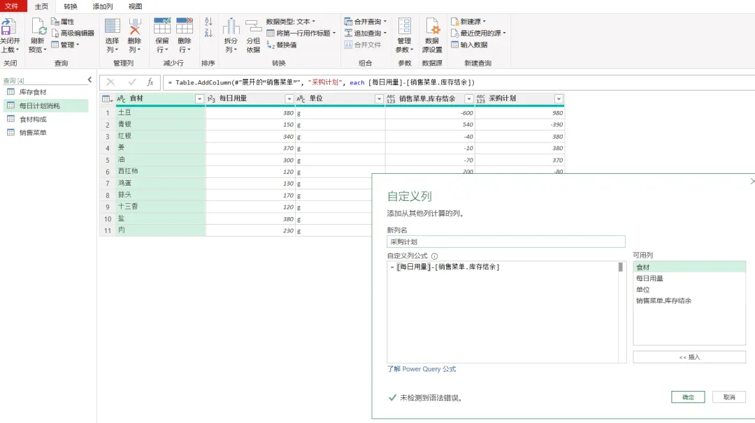 EXCEL|Power Query之综合案例:制定采购计划学了这么久的单独案例,咱们今天来讲一个综合案例。背景介绍:餐厅根据每天的点菜记录,统计食材消耗,再根据食材消耗匹配库存,计算出剩余库存量。这个剩余库存量匹配每日计划消耗量,库存不足于满足每日计划消耗量的,就要进行采买。而这个每日计划消耗量就相当于是安全库存的概念。这个值的设置基本参考的是历史销售数据。下面4张表格是案例中会用到的,我们保存在一个工作簿的4个插页里。这样就能一次性导入到查询编辑器里了。今天主要用到的就是合并查询,经过几波合并查询,就把各组需要对比的数据倒腾到一张表格里了。1)选择销售菜单这张表格,然后选择功能区的合并查询,要合并的是食材构成这张表格,要实现的是列出每个菜品对应的食材清单。操作如下图所示。2)合并后的表格,我们只选择我们需要的2列-食材和用量,把他们显示出来,操作如下图所示。3)计算点菜份数对应的总的食材用量,操作如下图所示。4)因为点菜中用的食材是有重复的,所以我们这步就是统计出按照食材的维度,所有点菜用到的食材总量。这里用到了分组依据,操作如下图所示。5)用量计算出来了,就需要看这个用量跟库存量的对比度。如下图所示,用的依然是合并查询。而且连接种类依然是左外部。6)计算出库存结余,就是库存量减去销售订单消耗量,操作如下图所示。7)结果如下图所示。负的代表库存不足。8)切换表格到每日计划消耗表格,通过合并查询,把销售菜单里的库存结余并到每日计划消耗表格里。操作如下图所示。9)把库存结余列勾选显示出来。然后插入自定义列,我们用每日用量跟库存结余做差异对比,操作如下图所示。10)筛选出大于等于0的,就是我们需要进行采买的食材和数量。11)要采买的就是下面这些了。好了,今天内容就这些。其实就是通过表与表的连接做信息对称,最后得出我们需要的运算结果。到今天,Power Query的案例也讲了一些了。明天开始,我们会开始讲一下Power Query的结构构成。熟悉了结构构成,或许我们在使用的时候,会更得心应手。