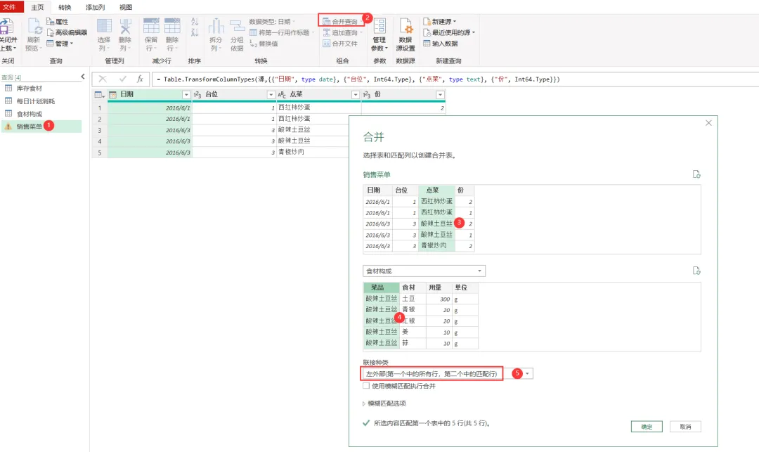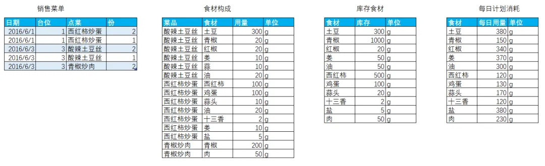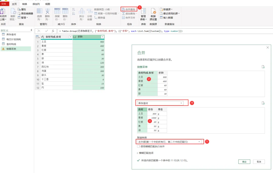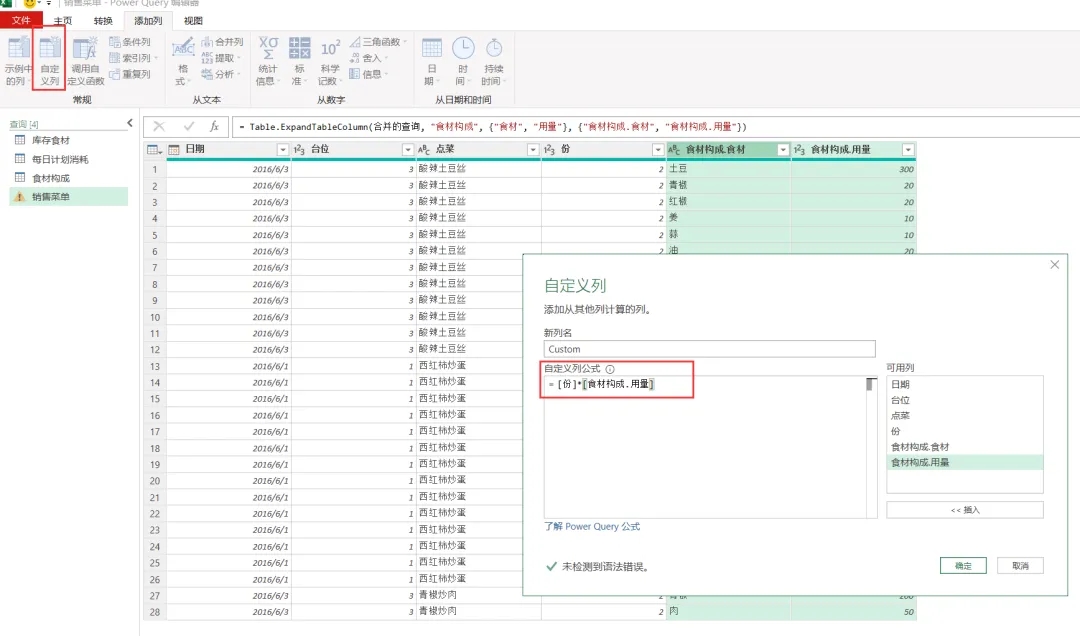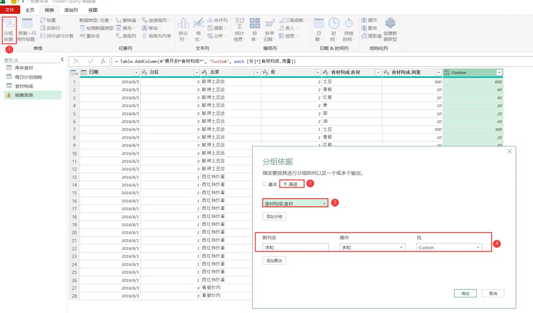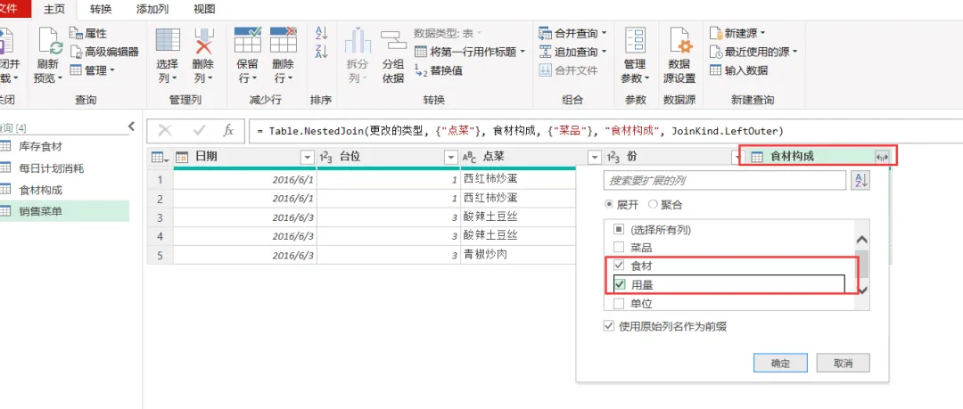 EXCEL|Power Query之综合案例:制定采购计划学了这么久的单独案例,咱们今天来讲一个综合案例。背景介绍:餐厅根据每天的点菜记录,统计食材消耗,再根据食材消耗匹配库存,计算出剩余库存量。这个剩余库存量匹配每日计划消耗量,库存不足于满足每日计划消耗量的,就要进行采买。而这个每日计划消耗量就相当于是安全库存的概念。这个值的设置基本参考的是历史销售数据。下面4张表格是案例中会用到的,我们保存在一个工作簿的4个插页里。这样就能一次性导入到查询编辑器里了。今天主要用到的就是合并查询,经过几波合并查询,就把各组需要对比的数据倒腾到一张表格里了。1)选择销售菜单这张表格,然后选择功能区的合并查询,要合并的是食材构成这张表格,要实现的是列出每个菜品对应的食材清单。操作如下图所示。2)合并后的表格,我们只选择我们需要的2列-食材和用量,把他们显示出来,操作如下图所示。3)计算点菜份数对应的总的食材用量,操作如下图所示。4)因为点菜中用的食材是有重复的,所以我们这步就是统计出按照食材的维度,所有点菜用到的食材总量。这里用到了分组依据,操作如下图所示。5)用量计算出来了,就需要看这个用量跟库存量的对比度。如下图所示,用的依然是合并查询。而且连接种类依然是左外部。6)计算出库存结余,就是库存量减去销售订单消耗量,操作如下图所示。7)结果如下图所示。负的代表库存不足。8)切换表格到每日计划消耗表格,通过合并查询,把销售菜单里的库存结余并到每日计划消耗表格里。操作如下图所示。9)把库存结余列勾选显示出来。然后插入自定义列,我们用每日用量跟库存结余做差异对比,操作如下图所示。10)筛选出大于等于0的,就是我们需要进行采买的食材和数量。11)要采买的就是下面这些了。好了,今天内容就这些。其实就是通过表与表的连接做信息对称,最后得出我们需要的运算结果。到今天,Power Query的案例也讲了一些了。明天开始,我们会开始讲一下Power Query的结构构成。熟悉了结构构成,或许我们在使用的时候,会更得心应手。