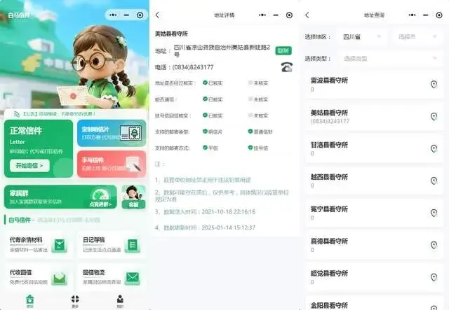 收件人信息:必须精确到监区或分箱。白马程序内置了实时更新的全国监管单位地址库,支持一键导入,确保地址万无一失。 笔迹还原:我们不仅支持微信/抖音双端小程序操作,而且只要是手写拍照的信件通过PS修图技术,白马能完美还原真实笔迹(彩印手写信)。在2026年,带有温度的手写感依然是缓解亲人焦虑的最佳良药。 极速时效:我们坚持每日发货,四川发货,广东、重庆等市区平均次日达。