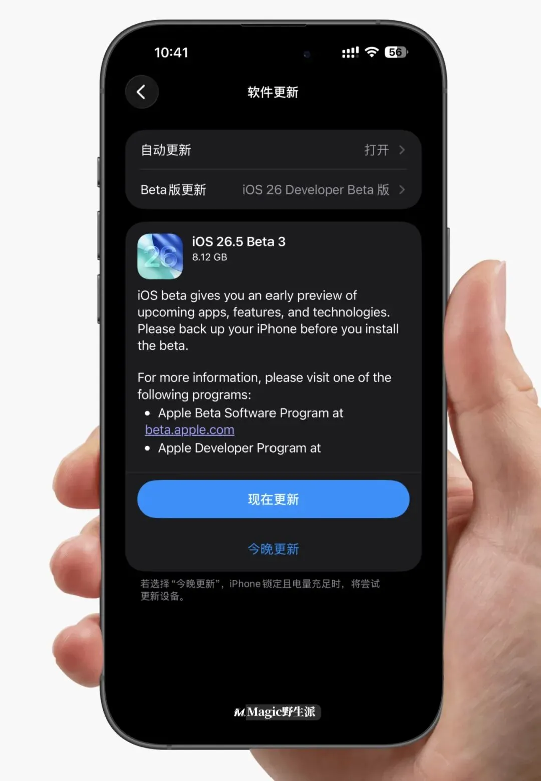 终于舒服了!iOS 26.5 系统更新发布!上个iOS 26.5 系统版本因为卡顿等问题,导致很多用户不敢升级;现在终于迎来第三版系统更新了;苹果今天凌晨时间向测试用户推送iOS 26.5 Beta 3系统更新,此次版本更新修复及优化了一些问题;