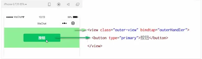 点击内部的按钮时,点击事件以冒泡的方式向外扩散,也会触发外层view的tap 事件处理函数。