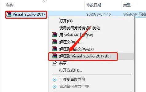 1、下载Visual Studio 2017软件安装包到电脑上,右键选择【解压到Visual Studio 2017】。