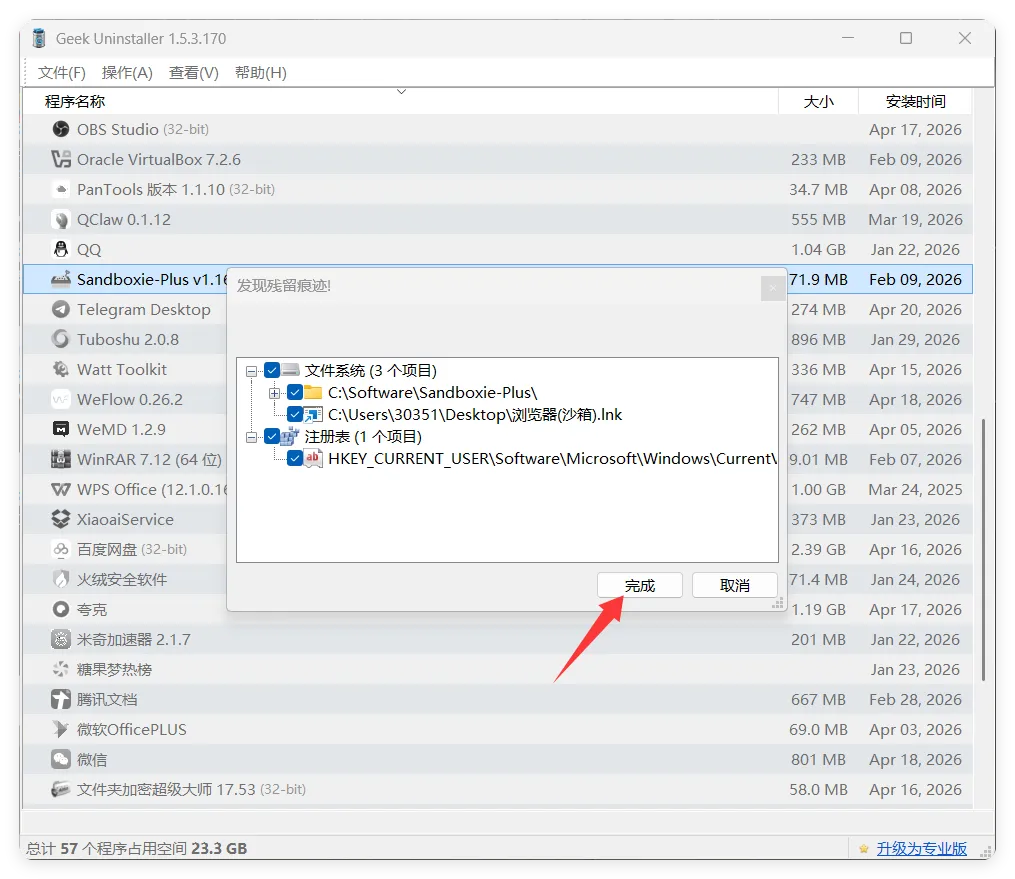 卸载完成后,软件还会自动扫描残余的注册表和残留痕迹,点击完成,就可以把软件卸载得一干二净