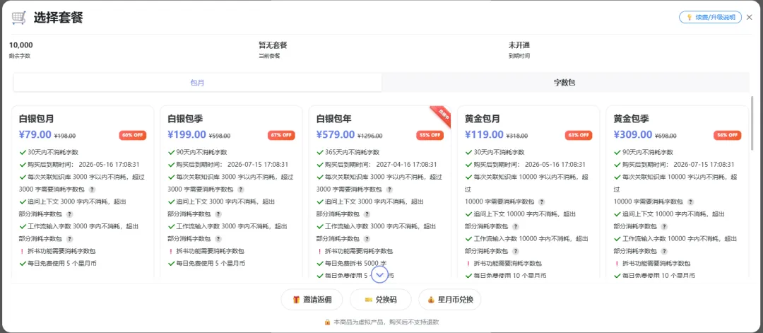 免费字数额度用完后,用户就需要付费购买字数包或开通会员,目前字数包价格是 9.9 元/10 万字;会员按照权益不同分为白银、黄金、钻石、至尊四档,每档又有包月、包季、包年的区分。最便宜的白银包月会员 79 元,最贵的至尊包年会员 1799 元。这也是星月写作最主要的盈利模式。