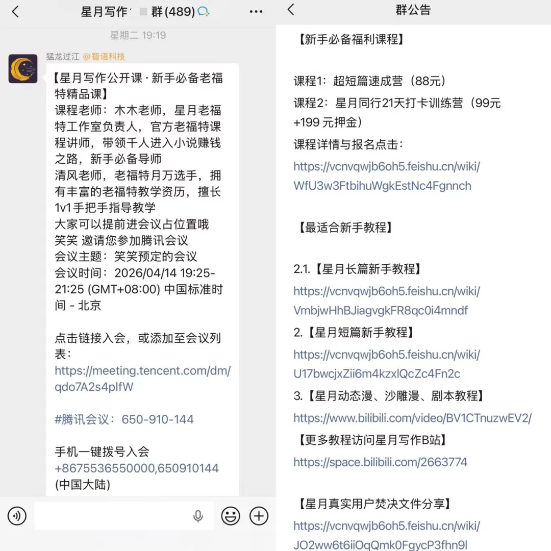 群主 @猛龙过江 每周会转发 2-3 条星月写作自媒体账号发布的干货视频和使用教程,比如“月入过万作者开书全流程”“都市种田阅读榜第一作者分享”。这些网文大佬的真实赚钱案例,既能给新手信心,也顺便用“领字数包”“领创作文档”等福利,引导群友去 B站 看视频、帮账号做数据。更值得一提的是,群里不定期还有网文大佬上免费公开课,毫无保留地分享自己的创作心得和实战技巧。
