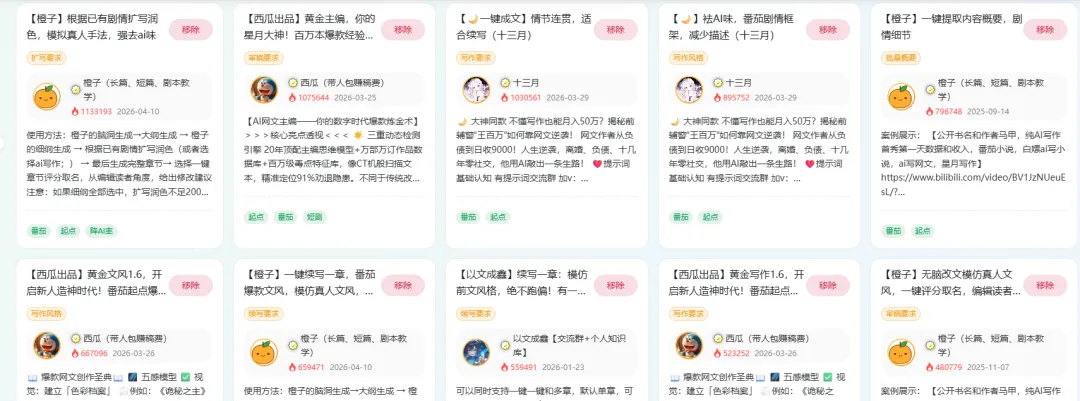 星月写作的提示词是封闭的,用户只能看到基本信息。早期是创始人自己写提示词,后来办“提示词大赛”,用字数包和现金奖励鼓励用户创作。