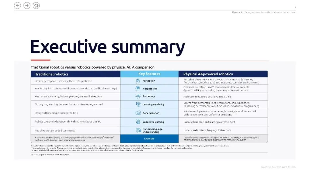 - Shift in Robotics: Traditional robotics operates in structured environments and follows fixed, pre-programmed instructions, while physical AI enables robots to work in unstructured settings and learn from experience.