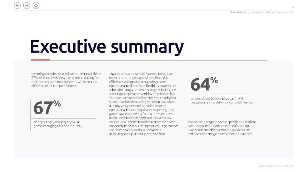 - Adoption Trends: Over 79% of organizations are already engaged with physical AI, with 27% deploying or scaling it. The majority of executives (67%) believe it will be a game-changer for their industry, and 64% expect it to become a critical driver of competitiveness.