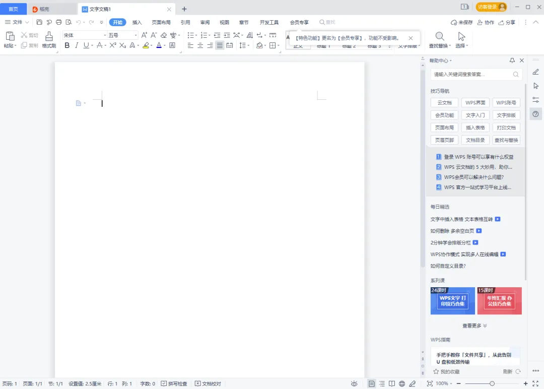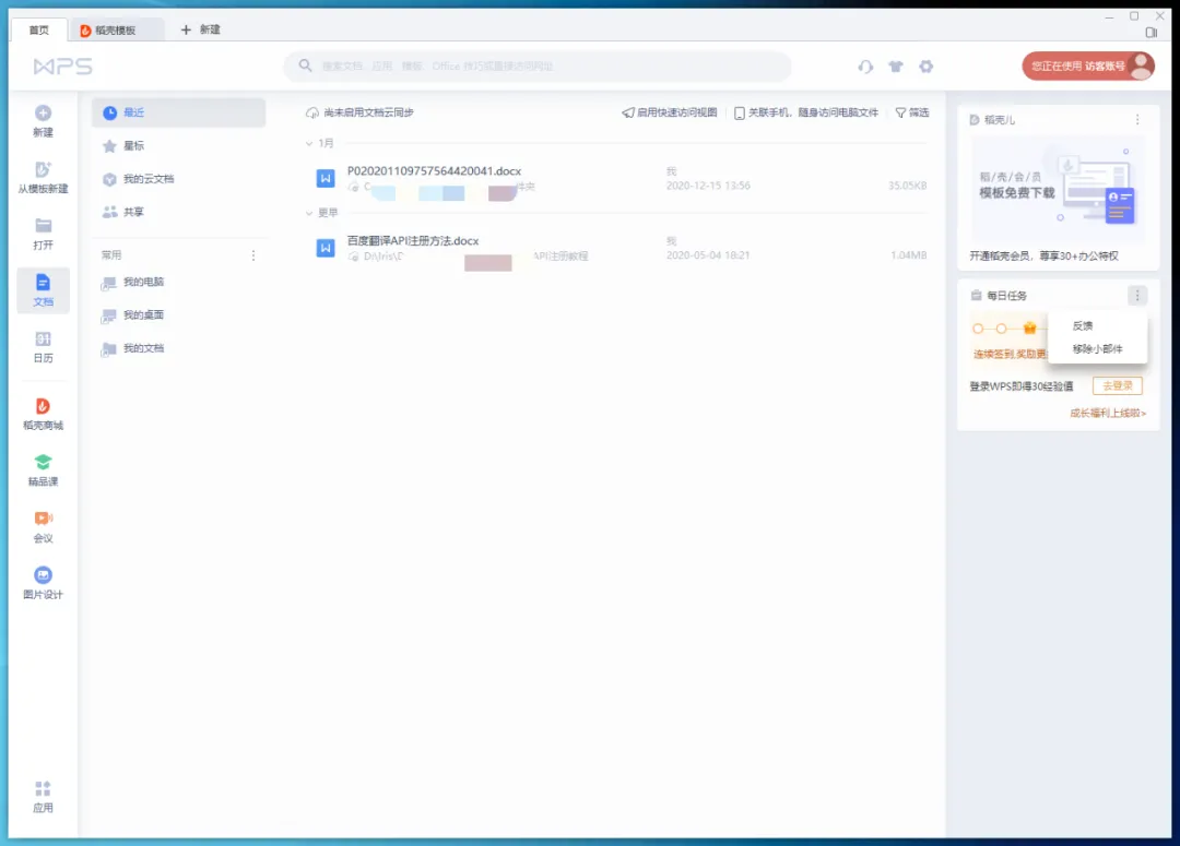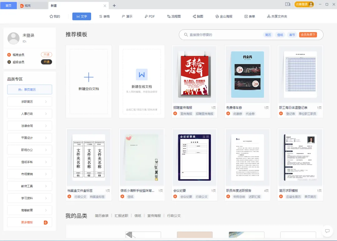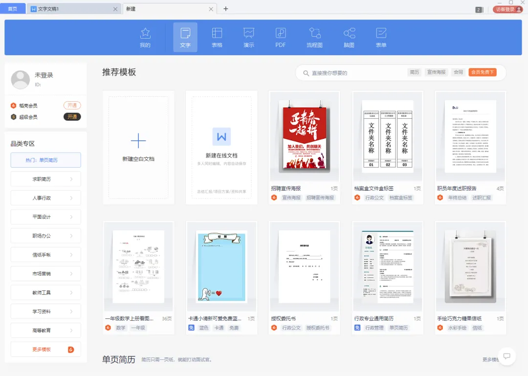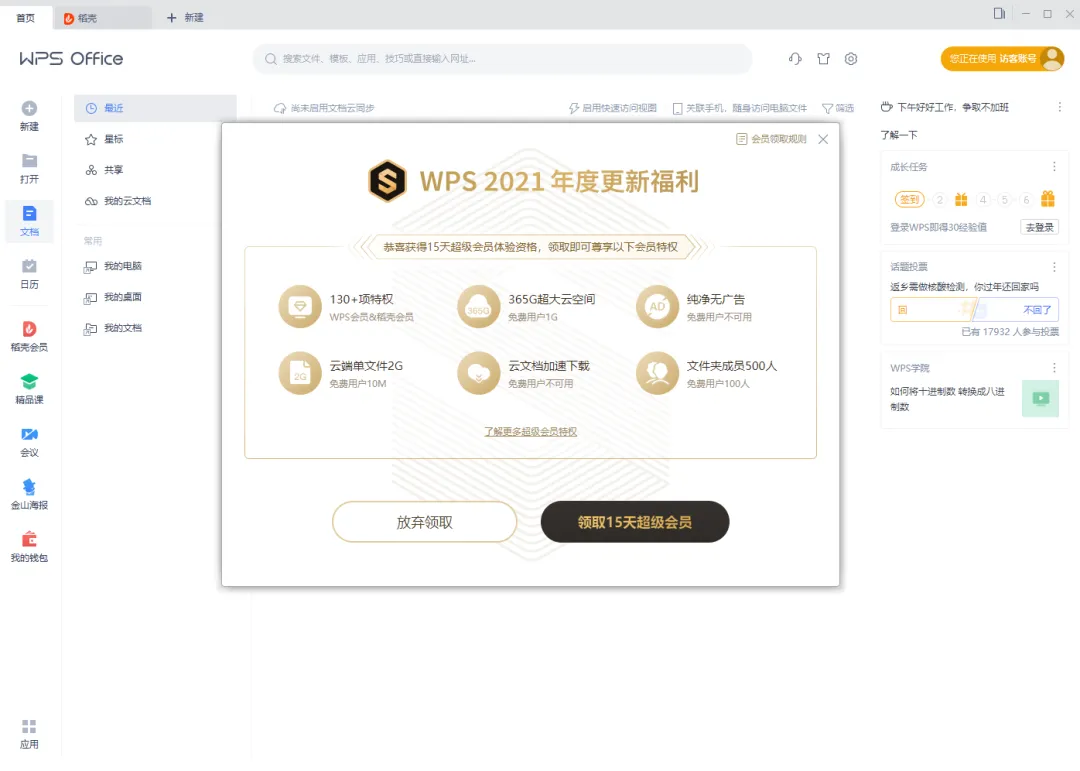 考试版相比官方标准版,功能并没有什么缺失,登录、会员、模板库、云文档、同步、PDF 转换等都一应俱全。