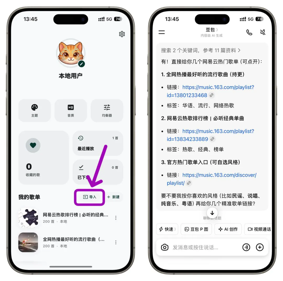 安装好融音乐后,想听歌的话需要导入歌单,没有歌单链接可以问豆包要!