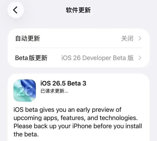 苹果发布 iOS 26.5 新系统,终于不卡顿了!今天凌晨,苹果推送了 iOS 26.5 Beta 3 开发者预览版系统,同步推送的新系统包括:iOS 26.5 Beta 3:23F5059eiPadOS 26.5 Beta 3:23F5059ewatchOS 26.5 Beta 3:23T5558emacOS 26.5 Beta 3:23F5058evisionOS 26.5 Beta 3:23O5458etvOS 26.5 Beta 3:23L5460d该版本只是一次例行更新,并没有带来什么新功能,主要就是修复了上个版本锁屏界面掉帧卡顿的问题。