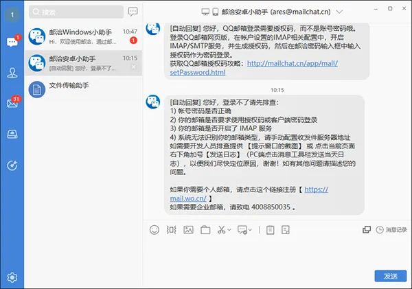 邮洽Mailchat电脑版是一款主打“邮箱+聊天”融合的商务办公软件,能帮你一站式管理新浪、网易、雅虎、Gmail等几乎所有常见邮箱,支持 95 万种个人和企业邮箱账号,收发切换都很流畅。