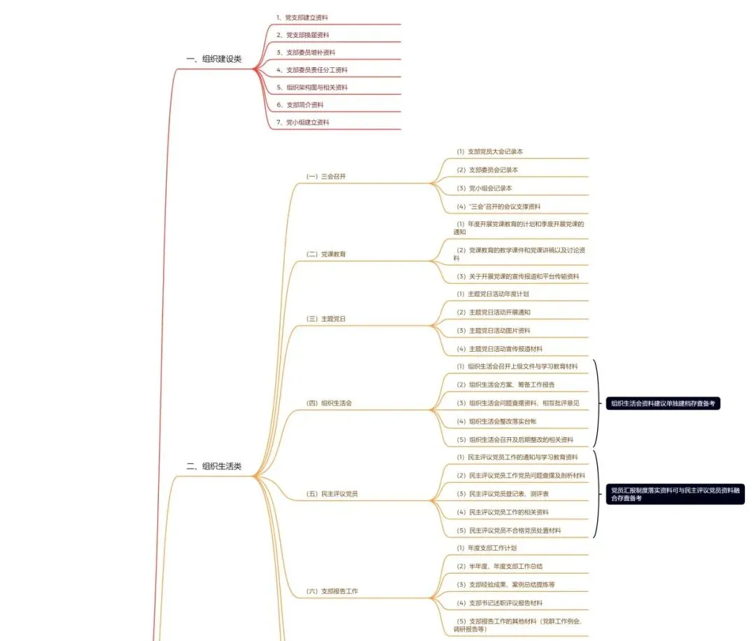 先给大家放台账框架的核心部分,涵盖组织建设、三会一课、主题党日、组织生活会这些迎检必查项,帮你先对照自查有没有漏项。完整的全流程思维导图(含党员管理、宣传工作、群众工作全模块,可直接 A3 打印对照整理),后台回复关键词即可获取。