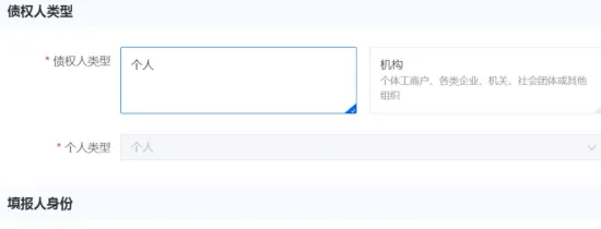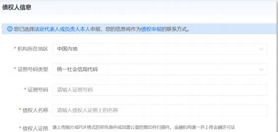 (2)机构债权人的法定代表人/负责人申报,需登记以下信息。