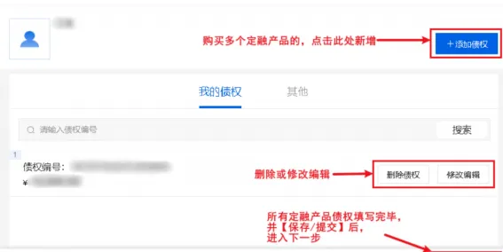 点击添加一笔债权,可以就购买的一个定融产品债权进行申报。