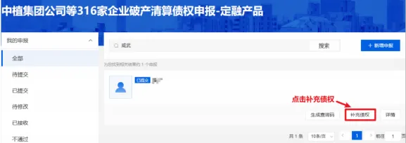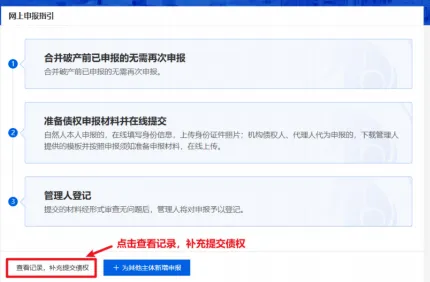 参考一、准备工作,点击【查看记录,补充提交债权】进入申报记录列表。