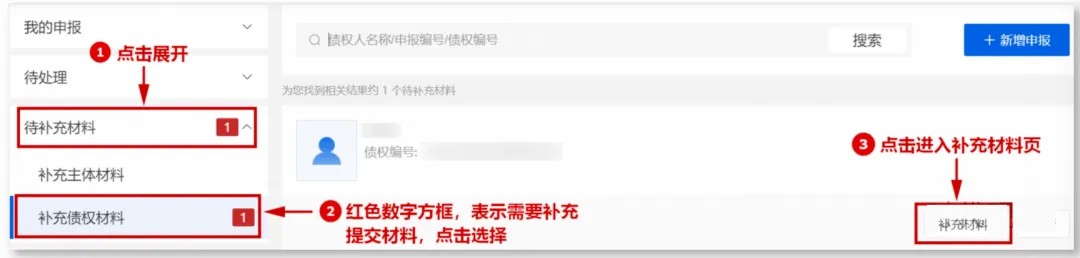 若有待补充材料的债权,【补充债权材料】后会出现红色方框。
