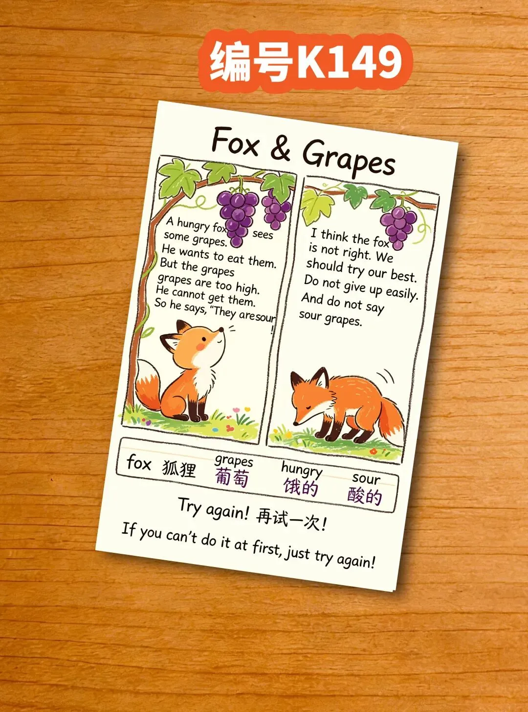 中文:我觉得狐狸不对。我们应该尽力,不轻易放弃,也不说“酸葡萄”这样的话。