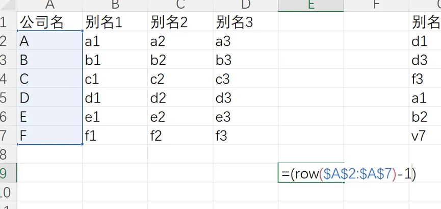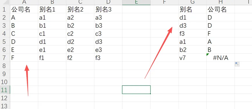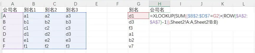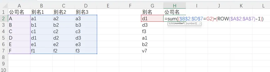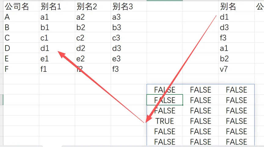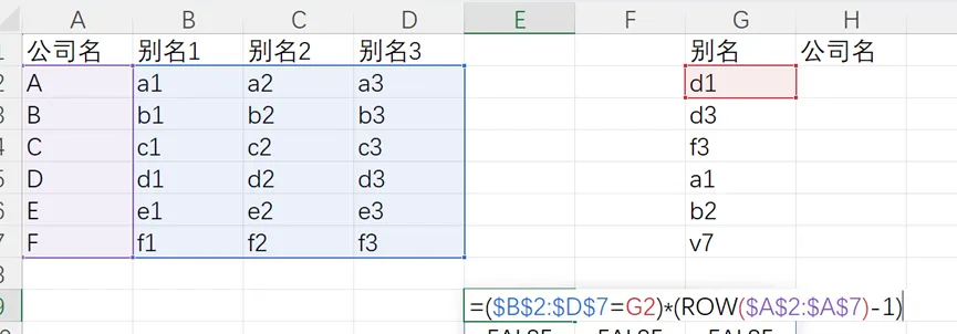 A列是公司的原名称,但是每个公司有多个别名。现在要通过任意一个别名去匹配公司的原名称。