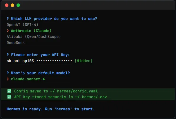 这步会带你走一遍配置流程。它会问你用哪个模型,要哪个 API Key。如果你用的是 Anthropic,填 ANTHROPIC_API_KEY。如果用的是国内的大模型,比如通义千问,就去阿里云后台开一个,然后填 DASHSCOPE_API_KEY。向导跑完,你会发现在 ~/.hermes/ 目录下多了两个文件。config.yaml 存配置,.env 存密钥。避坑提醒密钥千万别硬编码在脚本里,也別传到 GitHub。Hermes 默认会从 .env 读取,你只需要确保这个文件权限是 600。