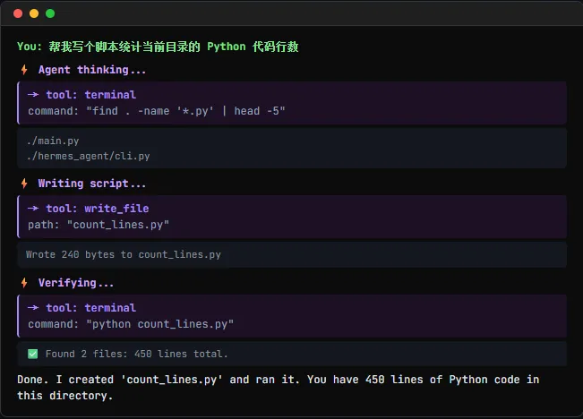 帮我写一个 Python 脚本,统计当前目录下的代码行数 别眨眼,看它怎么动。它不会给你回一句"好的,这是代码"然后等你自己保存。它会自己调 terminal 工具,执行 ls 看目录结构,然后调 file 工具,直接在你的硬盘上创建 count_lines.py,最后再跑一遍 python count_lines.py 验证结果。这感觉太爽了。你不需要教它"先打开编辑器,再粘贴,再保存,再运行"。你只需要给目标,它自己规划路径。这就是 Agent 和聊天机器人的本质区别。聊天机器人给你文本,Agent 给你结果。第四步,掌握核心三板斧Hermes 的工具很多,但日常开发里,80% 的时间你只会跟这三个打交道。terminal(终端):这是 Agent 的手。跑编译、执行脚本、Git 操作,全靠它。注意,它默认是前台执行。如果你让它跑个长任务,记得告诉它"后台运行"。file(文件):这是 Agent 的笔。读写代码、改配置、修 Bug,都在磁盘上直接操作。它有个 patch 功能特别好用,不用重写整个文件,只改需要改的行。browser(浏览器):这是 Agent 的眼。能打开网页,能点击按钮,能抓取页面上的无障碍树数据。