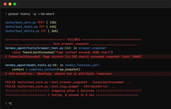 /skills load architecture-diagram它会自动加载写好的模板、设计规范、输出要求。下次你只要说"帮我画个 Redis 集群架构图",它直接出图,格式分毫不差。 Memory 是什么?就是跨 Session 的长期记忆。很多 Agent 有个毛病,你关掉窗口,它就失忆了。明天再来,它又问你"你喜欢什么代码风格?"Hermes 把记忆做成了持久化的 SQLite。你在对话里随口说一句:记住,我习惯用黑底白字的终端,代码里别加无用的 type hint 它会自动调 memory 工具,把这条偏好存进数据库。下次你再开新对话,它启动第一件事就是读记忆。这种连续性,是建立信任的关键。第六步,那些我踩过的坑搞 Agent 不是写 PPT,坑多得要命。我把最常遇到的三个列出来,你直接绕过去就行。坑一:Token 爆了现象:Agent 跑着跑着突然卡住,或者开始胡说八道。原因:90% 是上下文超了。解决:用 /clear 清空当前对话历史,或者在 config.yaml 里把模型切换到支持更长上下文的版本。