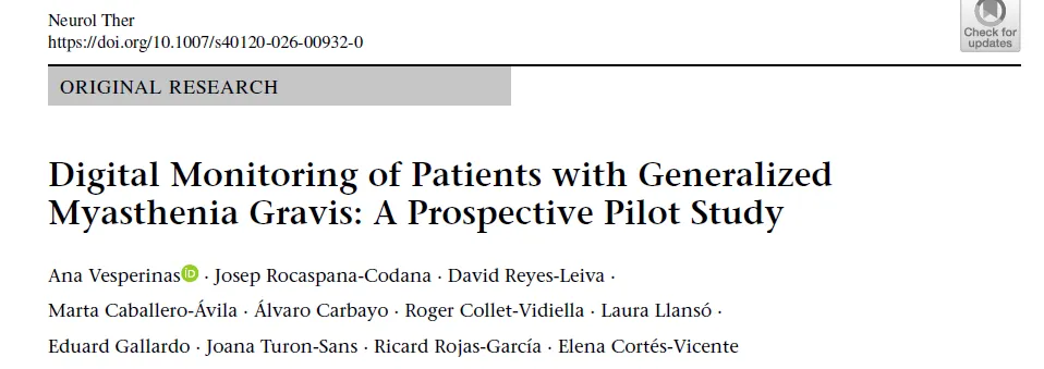 由此,2026年《Neurology and Therapy》发表西班牙学者题为“Digital Monitoring of Patients with Generalized Myasthenia Gravis: A Prospective Pilot Study”的研究,尝试通过智能手机端MG-ADL连续采集,重构MG随访模式,并验证其在真实临床路径中的可行性与价值。