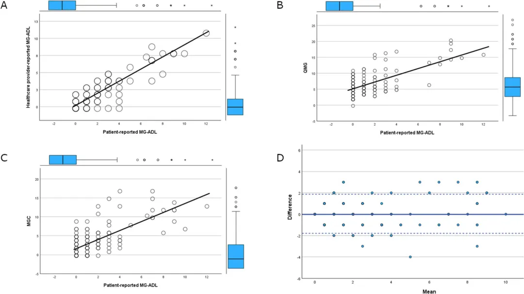 换言之,MG-ADL并非“替代QMG”,而是在时间维度上补充其盲区。这种差异在Δ值分析中进一步被强化:患者与医生ΔMG-ADL相关性达0.713,说明其对“变化”的捕捉能力优于对“绝对状态”的刻画。