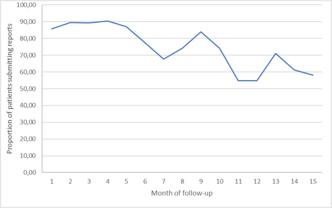 图2(第6页)显示依从性从前5个月>85%下降至后期55–71%。这一趋势并非简单行为问题,而提示数字监测存在“使用疲劳曲线”。其临床含义在于:连续监测更适用于疾病活动期,而非稳定期的长期维持。